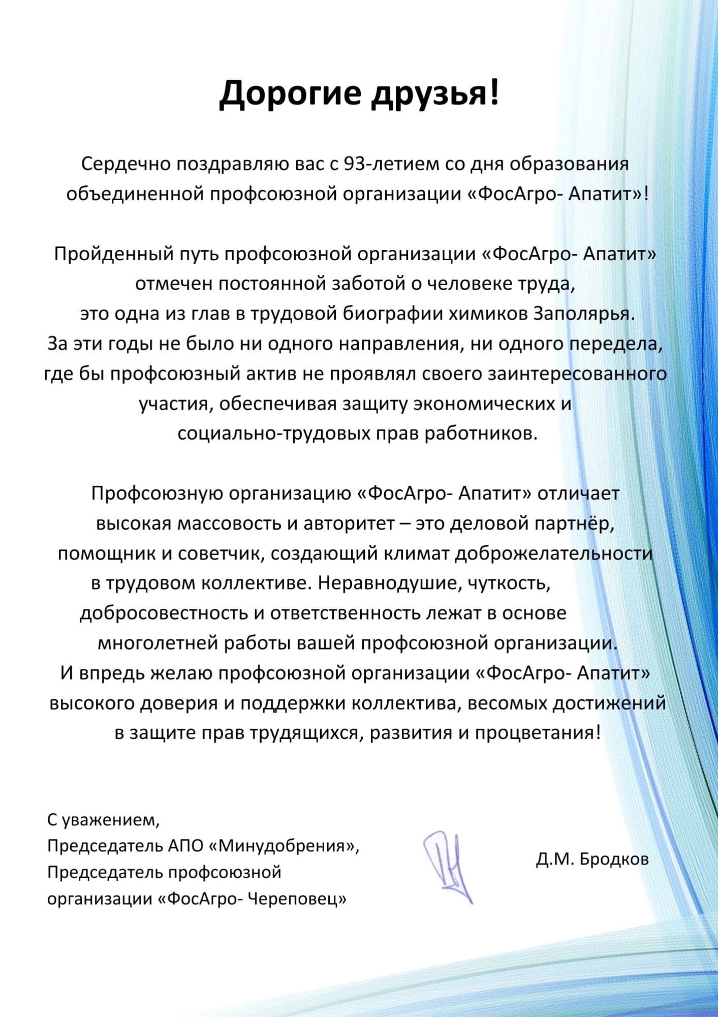 «Профсоюзная организация «ФосАгро-Череповец» поздравляет с 93-летием со дня образования объединенной профсоюзной организации «ФосАгро-Апатит»!