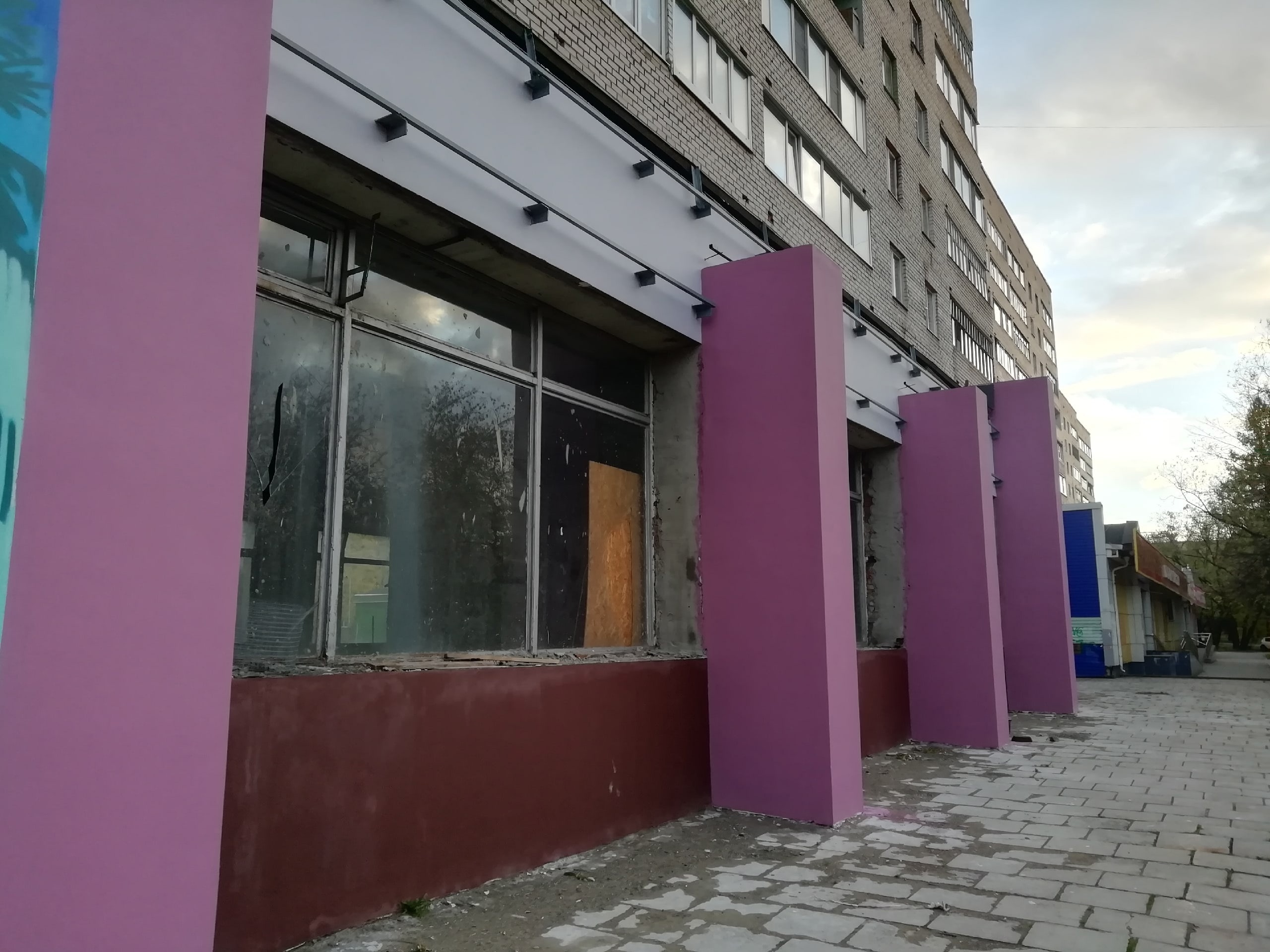 Фасад Здесь много лет стояли палаткиНовый собственник, по некоторым данным, намерен открыть там торговый центр. Рынок с палатками образца 90-х давно исчез, а реконструкцию помещения начали с фасада. Стены перекрашены в сиреневый цвет, а в воскресенье на фасаде, выходящем на улицу Архангельскую, появился красивый рисунок.