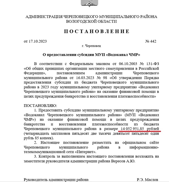 Постановление подписал глава администрации района Роман Маслов - как сказано в документе, «в целях предупреждения банкротства и восстановления платежеспособности». «Водоканал Череповецкого муниципального района» лихорадит давно, и стабилизировать его без бюджетных вливаний, видимо, не получается. Только за последние 3 года там сменились несколько директоров - Александр Поспелов, Владимир Маликов, Сергей Гордин, с июня этого года - выходец из МУП «Водоканал» Череповца Виктор Быков, но полностью вывести предприятие из кризиса пока не удалось никому.
