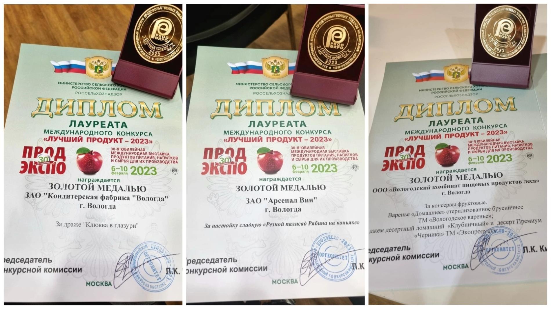Золотые медали также получили минеральная вода «Александровская» ООО «Продтовары Плюс»; фруктовые консервы, варенье «Домашнее» и джем ООО «Вологодский комбинат пищевых продуктов леса»; а также крупы ООО «Шакрил».