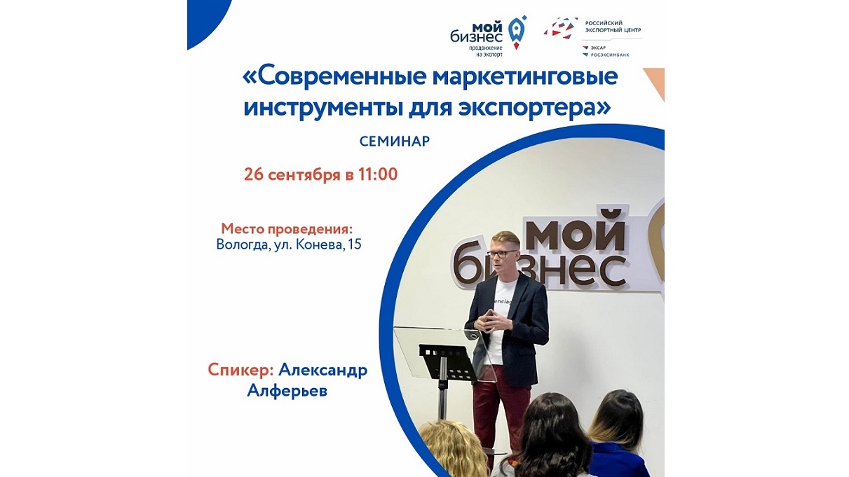 26 сентября в 11:00 в Центре «Мой бизнес» пройдет семинар-практикум «Современный маркетинговые инструменты для экспортёра». Спикером станет консультант по корпоративным коммуникациям, сертифицированный бизнес-наставник Росмолодёжи, Александр Алферьев.
