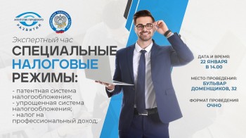 22 января в конференц-зале Агентства Городского Развития в 14.00 состоится бесплатный экспертный час "Специальные налоговые режимы: патентная система налогообложения, упрощенная система налогообложения, налог на профессиональный доход".