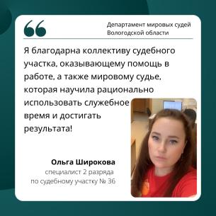 Поэтому продолжаем рассказывать о тех, кто, получив желанный диплом, оказался в нашем коллективе. И, два года назад на судебный участок № 36 Сокольского района пришла работать выпускница Вологодского колледжа связи и информационных технологий, — Ольга Широкова.