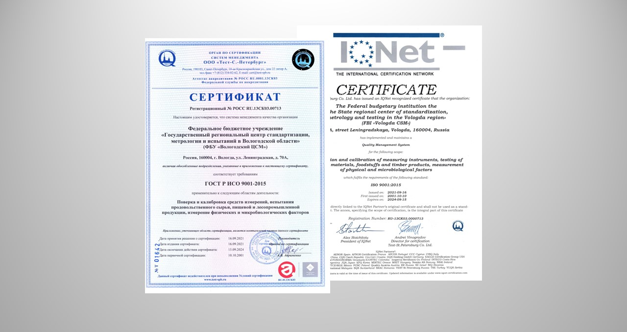 ФБУ «Вологодский ЦСМ» подтвердил действие международного сертификата соответствия требованиям ISO 9001:2015