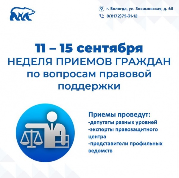 Так, в Региональной общественной приемной в Вологде по адресу: ул. Зосимовская, д. 65 приемы граждан проведут юристы Правозащитного центра «Единой России», представители регионального отделения Ассоциации юристов России, нотариальной палаты Вологодской области, федеральной службы судебных приставов по Вологодской области, уполномоченный по правам предпринимательства по Вологодской области.