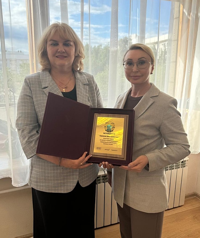 Кроме того, Ирина Данилова передала Ирине Карнаковой награду председателя Союза МКСО – почетный знак «За заслуги в развитии внешнего муниципального финансового контроля России».