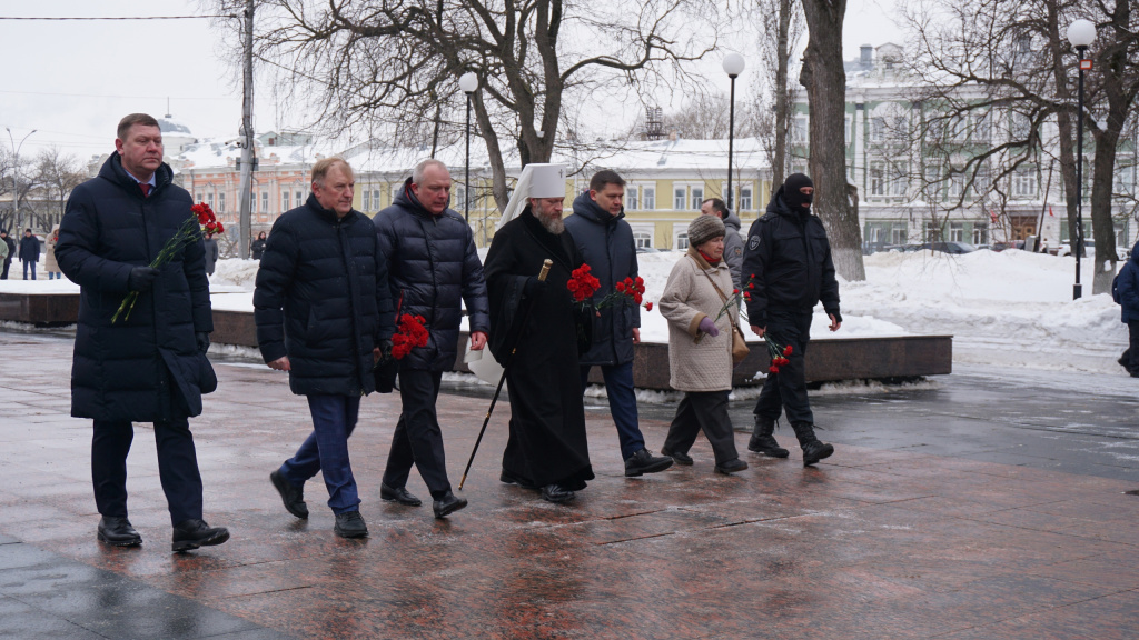 Торжественный митинг прошел в канун Дня защитника Отечества у мемориала «Вечный огонь» на площади Революции. Первые лица области и города, а также депутаты, представители силовых структур, кадеты и юнармейцы, ученики и воспитанники детских садов почтили память героев и возложили к мемориалу цветы.