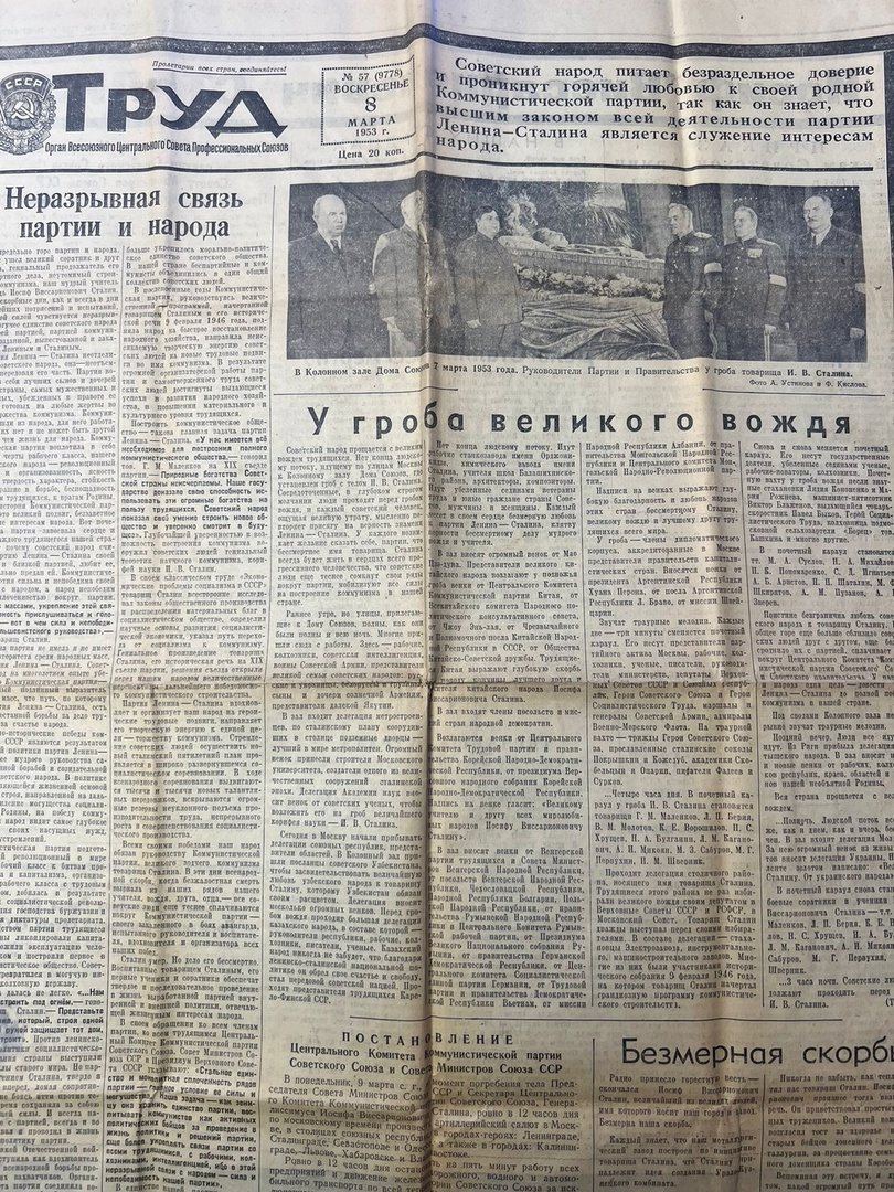 Он также опубликовал на своей странице номер газеты «Труд» от 8 марта 1953 года с публикациями о смерти Сталина.