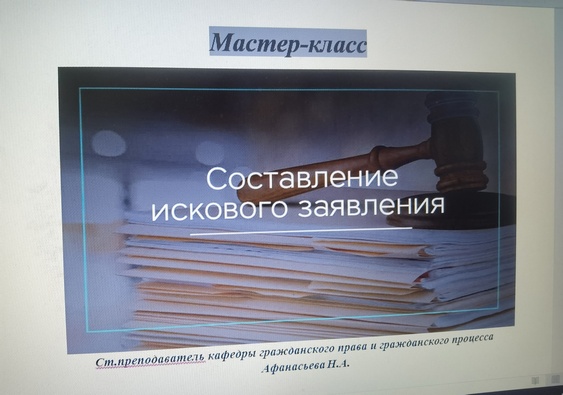 В ходе занятия студенты познакомились со структурой искового заявления, его составными частями и реквизитами; увидели образцы отдельных частей исковых заявлений из реальных гражданских дел.
