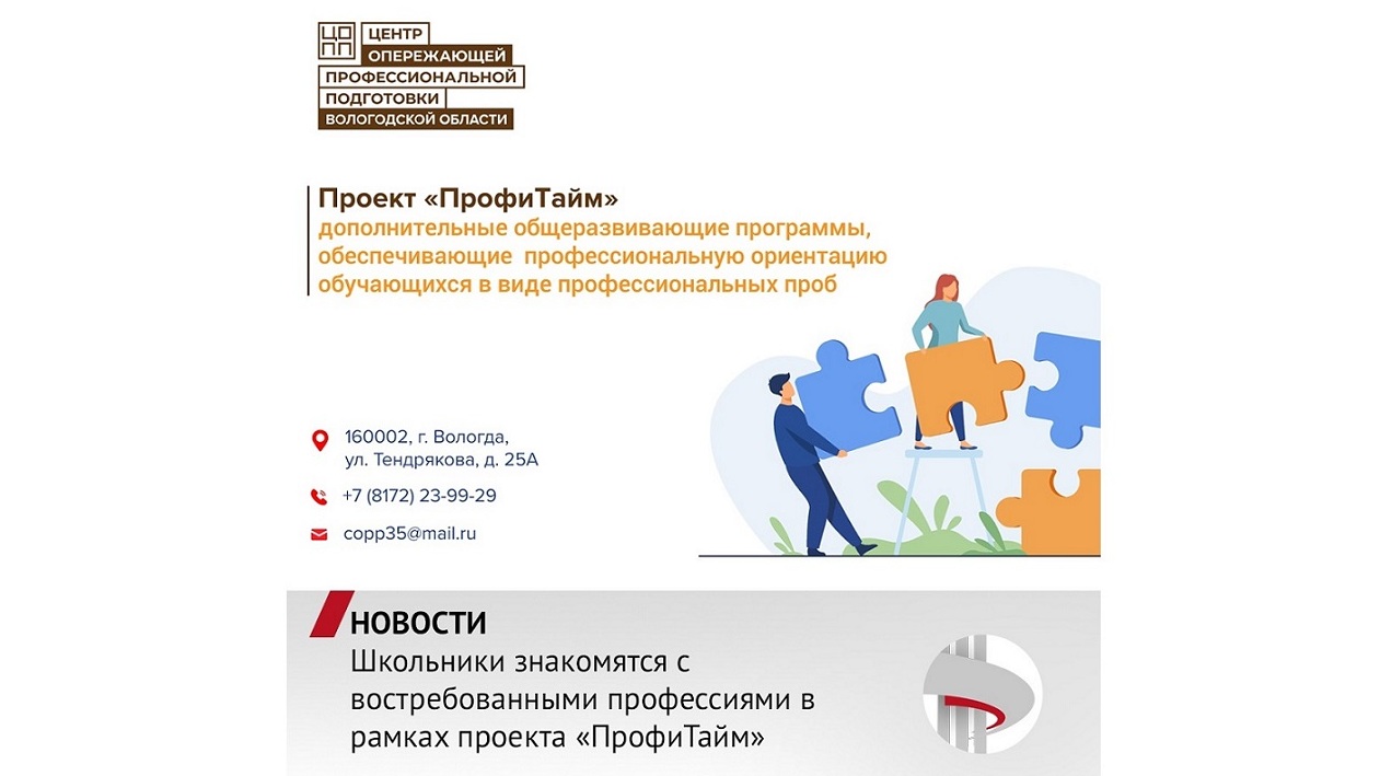 Профессиональные пробы доступны по четырем направлениям: техническое, естественно-научное, социально-педагогическое и художественное. Подробную информацию о проекте можно узнать по телефону 8 (8172) 23-99-29 и на цифровой платформе Центра опережающей профессиональной подготовки.