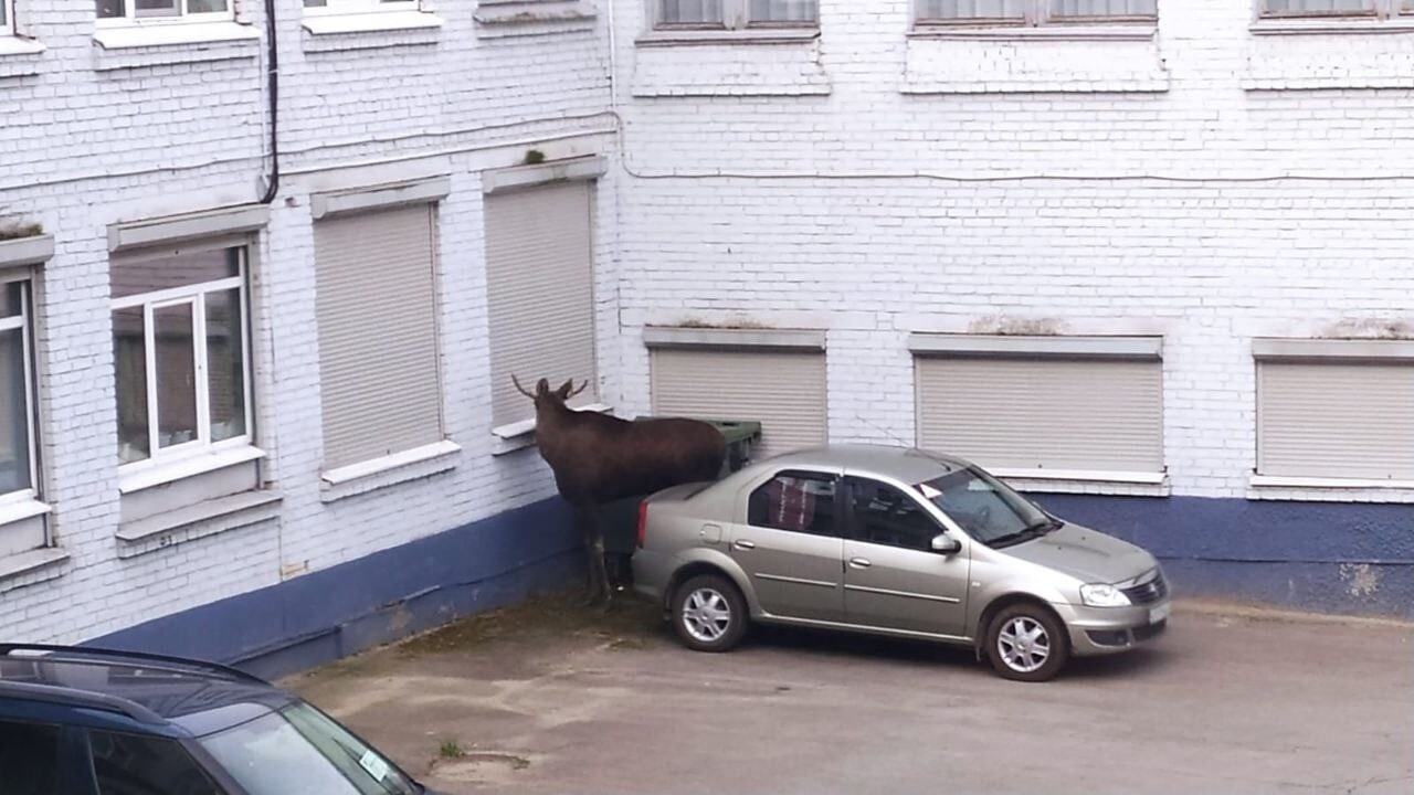 Жители Череповца в пятницу утром сфотографировали двух лосей, бродивших по территории лицея АМТЕК и заглядывавших в окна учебного заведения.