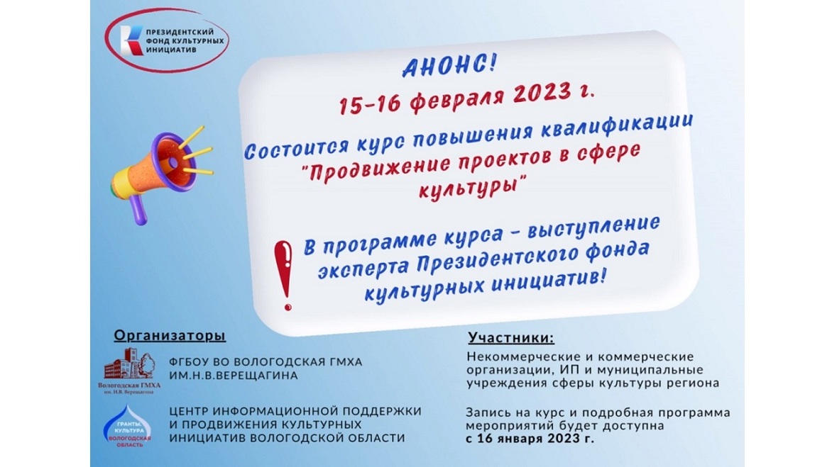 15 и 16 февраля в Вологодской ГМХА им. Н. В. Верещагина состоится обучение по программе повышения квалификации «Разработка грантовых проектов в сфере культуры».
