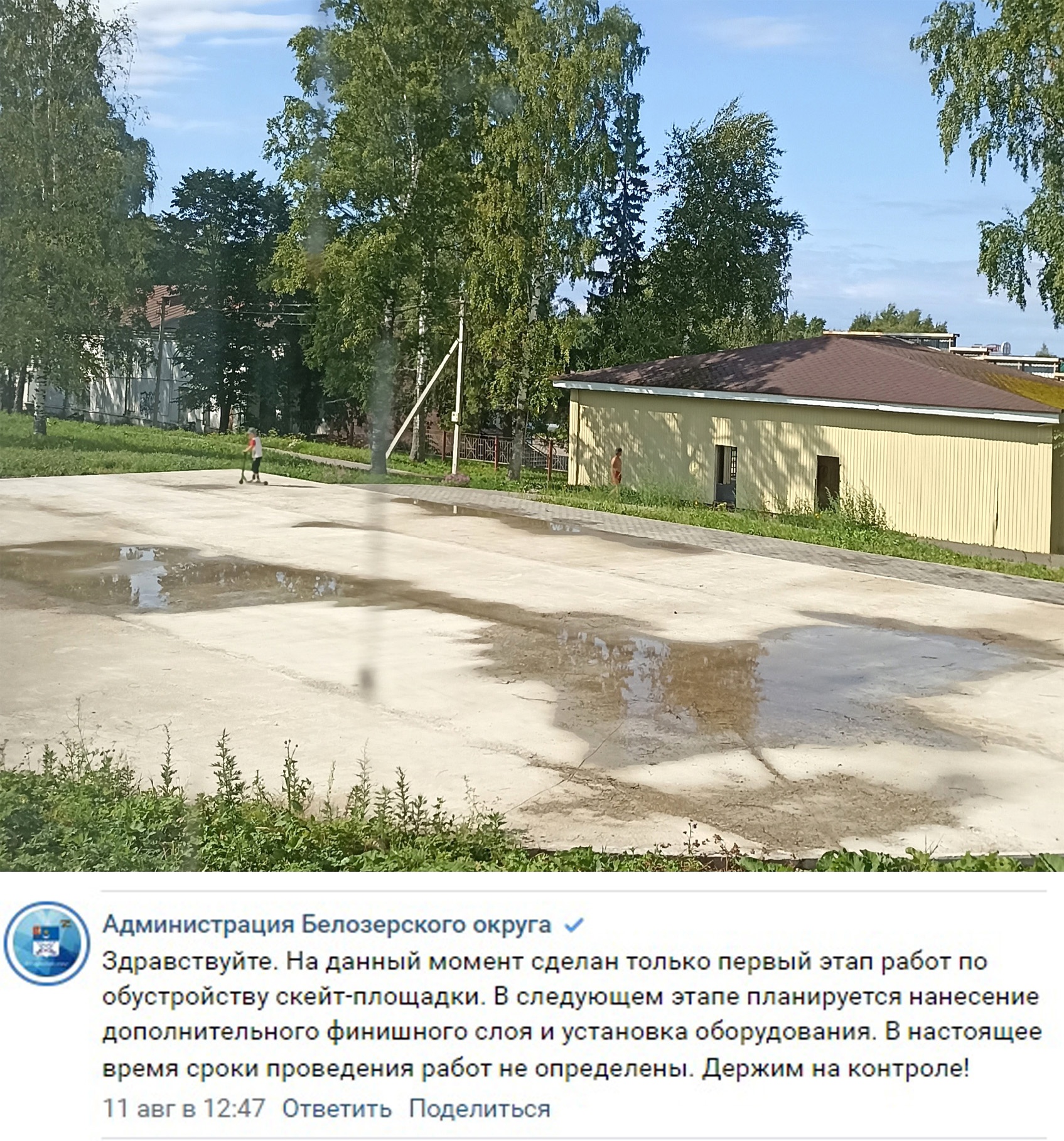 Вместо готовой скейт-площадки город получил грубое бетонное основание, построенное с явными нарушениями. Причем чиновники работы приняли и уплатили за недострой в общей сложности около 2,5 миллиона рублей. Чтобы как-то выпутаться из нехорошей ситуации, администрация Белозерского округа пытается запускать слухи о предстоящем втором этапе работ, хотя по контракту объект должны были сдать в готовом состоянии.