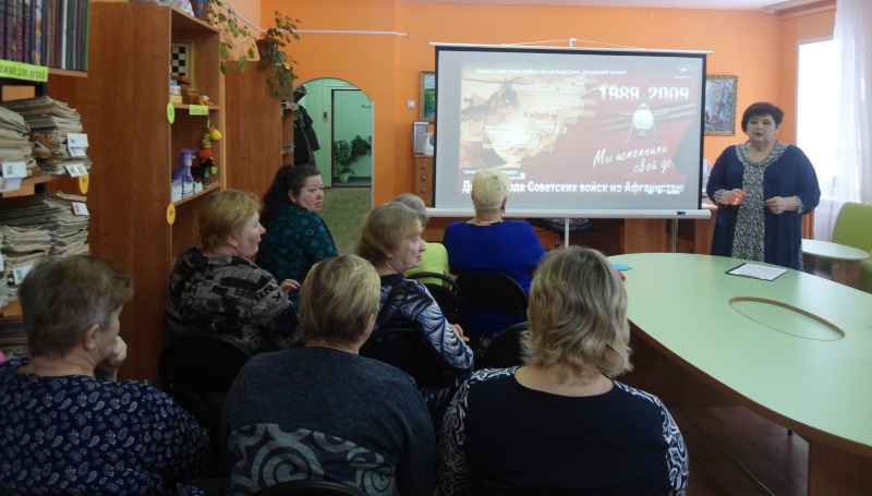 «Воевавшие дети не воевавших отцов» под таким названием прошел час мужества и оформлен стенд «Наша боль-Афганистан» в библиотеке. Члены клуба «Позитив+» отдали дань уважения тем, кто проявил высочайшую силу духа, самоотверженность, героизм, выполняя боевой долг в ДРА. На фоне общих сведений о той войне, подробно было рассказано о службе в Афганистане и гибели наших земляков, С. Парыгина и В. Попова.