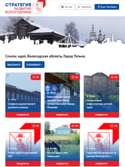 Всего от Тотемского округа поступило более полутора десятка предложений. Каждый может поддержать неограниченное число инициатив и даже предложить свою, зарегистрировавшись на сайте стратегия35.рф .