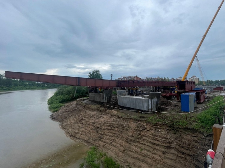 Металлическую конструкцию собирают на берегу и поэтапно надвигают на опоры с помощью промышленных домкратов. Скорость движения при надвижке пролета моста – от 5 см в минуту. Все работы идут в графике. На сегодняшний день надвинуто 15 из 243 метров металлоконструкций пролетного строения. Они надвигаются с правого берега реки на левый. На первом этапе выполнена надвижка на опору №3.