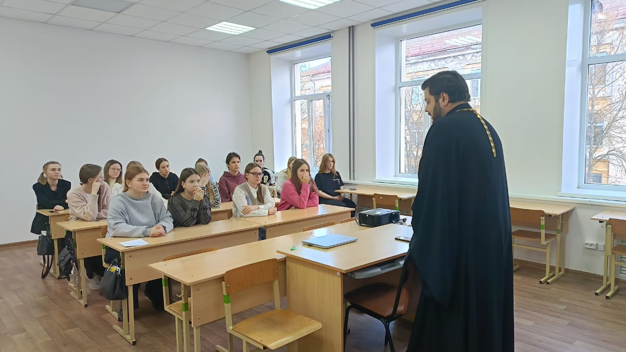 Очередную встречу провел сотрудник отдела иерей Михаил Болотский. Священник встретился со студентами колледжа и провел с обучающимися беседу на тему: «Для чего стоит человеку жить».
