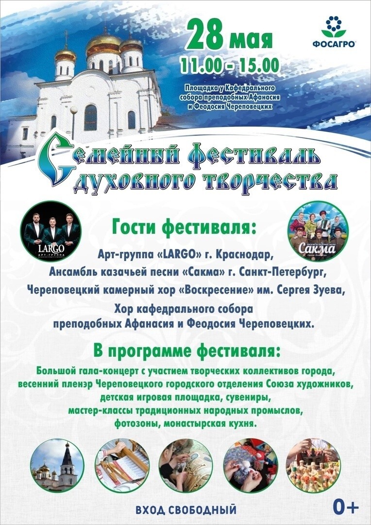 В Череповце завтра состоится семейный фестиваль духовного творчества. С 11 до 15 часов всех желающих приглашают на площадь перед кафедральным собором преподобных Афанасия и Феодосия.