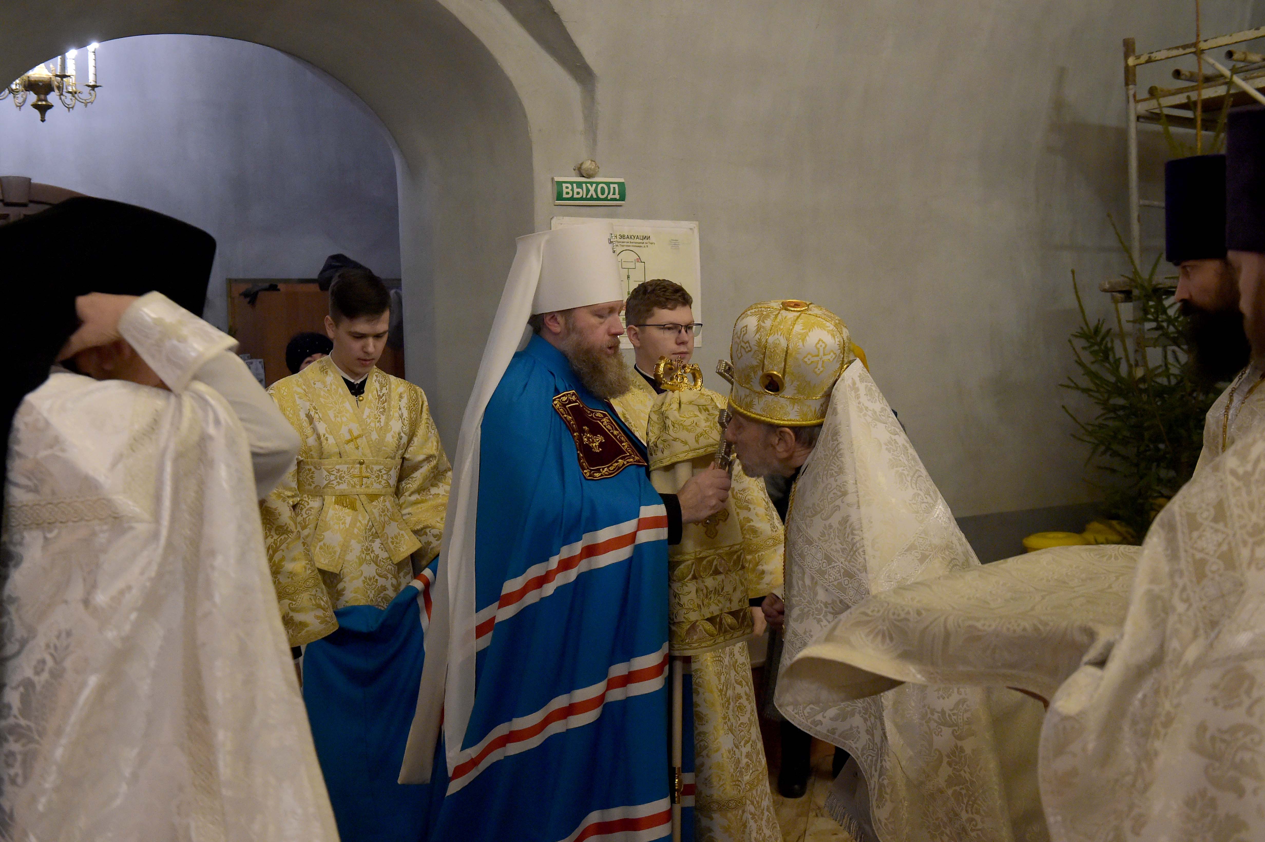 Правящему архиерею сослужили: благочинный Архиерейских подворий города Вологды, настоятель Архиерейского подворья храма Покрова Пресвятой Богородицы на Торгу иеромонах Сергий (Акимов), клирики храма протоиерей Сергий Телицын и протоиерей Александр Лебедев, руководитель Службы протокола Вологодской епархии иерей Андрей Кашинцев, клирик храма Покрова на Торгу иерей Сергий Попов.