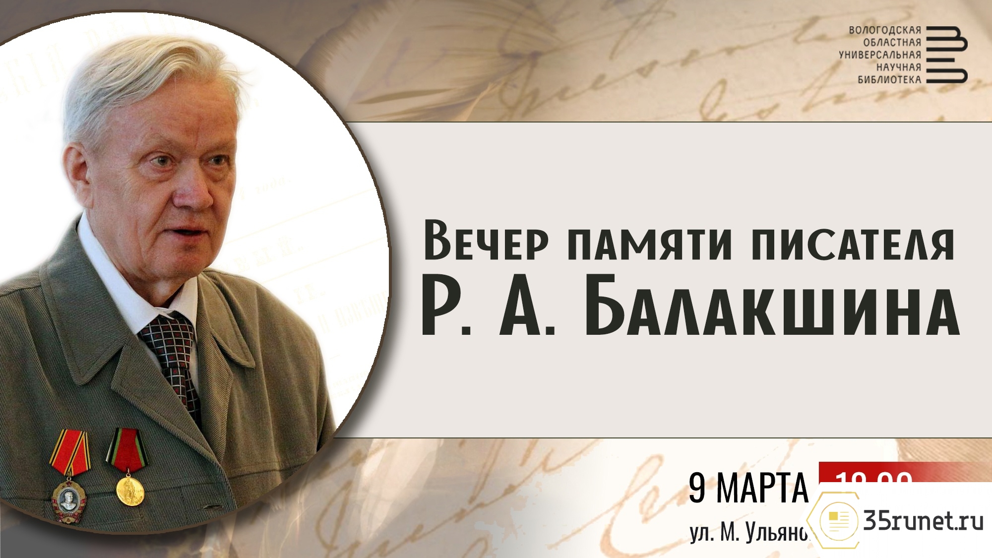 Вечер памяти вологодского писателя Роберта Балакшина пройдет в областной библиотеке Вологде 9 марта.