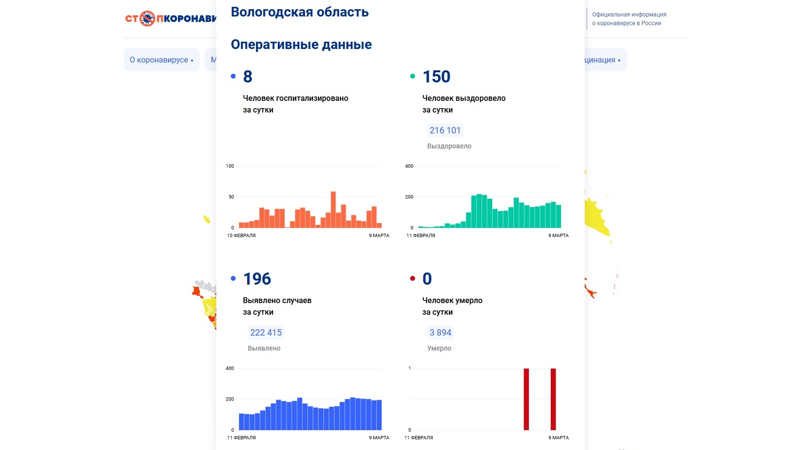 196 человек подцепили инфекцию, восемь попали в больницу, 150 вологжан смогли побороть болезнь. Об эпидситуации в регионе за последние сутки сообщает федеральный портал стопкоронавирус.рф.