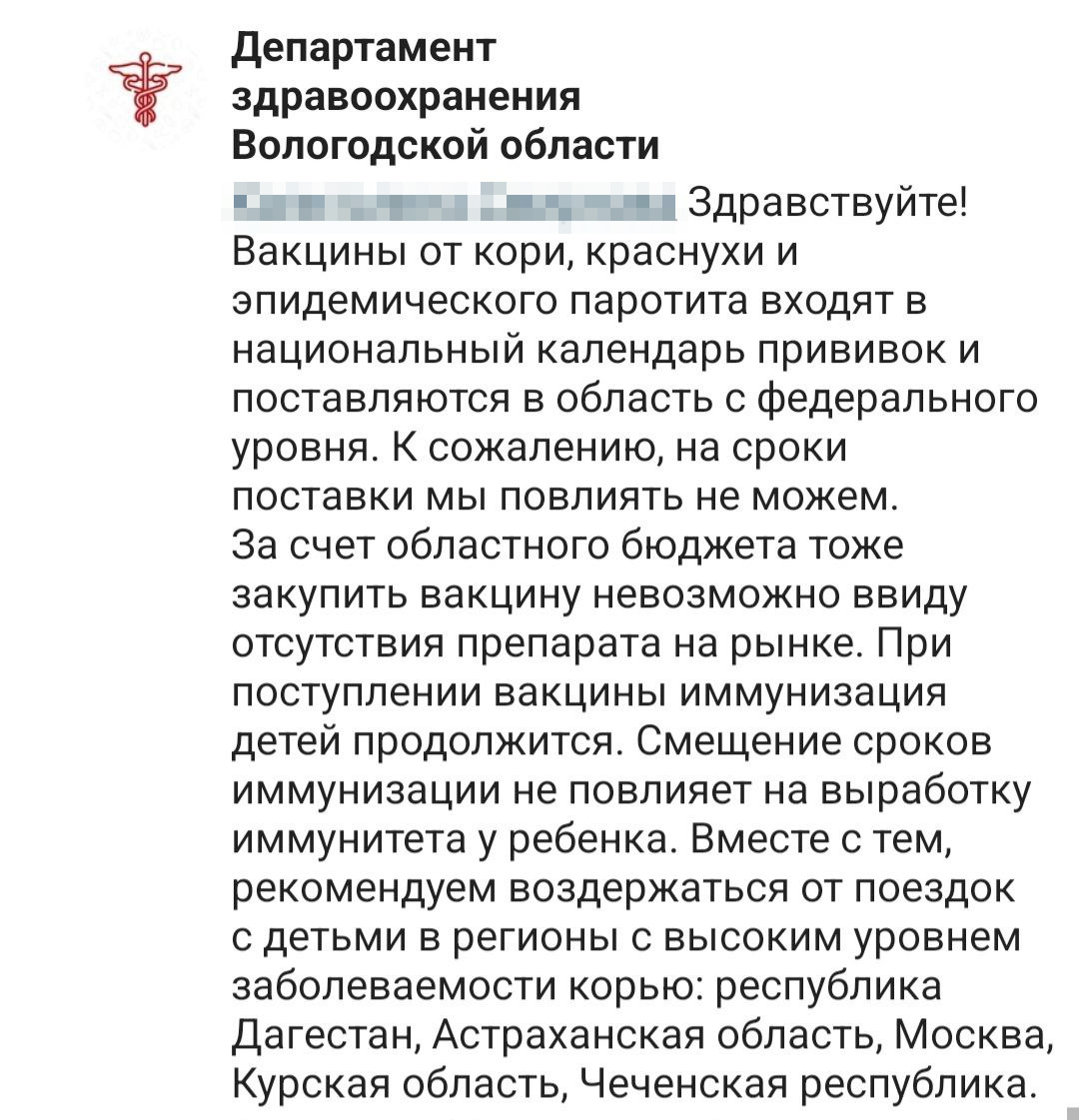 Острый дефицит вакцин начался во многих регионах, включая и Вологодскую область. Деньги на закупку вакцин от кори, краснухи и эпидемического паротита (свинка) выделены из областного бюджета, но их невозможно купить, - сообщает Департамент здравоохранения Вологодской области. В том числе невозможно повлиять на сроки доставки вакцин ввиду отсутствия препарата на рынке в России, - пояснили в департаменте. Иммунизация приостановлена. При поступлении вакцины она продолжится. Смещение сроков иммунизации не повлияет на выработку иммунитета у ребенка.